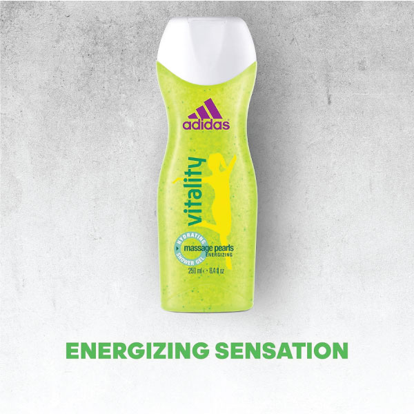 The true sport brand for men and women, offering the best and most complete personal care line to be at your best 24/7/365 in any situation. Whether you like, love or live sports, Adidas body care unlocks your full potential. Get ready. Created to help maintain your skin’s natural balance and invigorate your body and mind, Adidas vitality shower gel provides hydration to the body and leaves the skin feeling re-energized and vital. With a hydrating formula enriched with massage pearls, Adidas vitality shower gel gently cleanses and stimulates your body, leaving an energizing sensation on skin. The green and modern shower gel has a sparkling dreamy fragrance built around energizing citrus peel notes, softened by a fruity facet on a gentle musky cloud. For women who need extra hydration for their skin as well as a burst of energy for both body and mind.