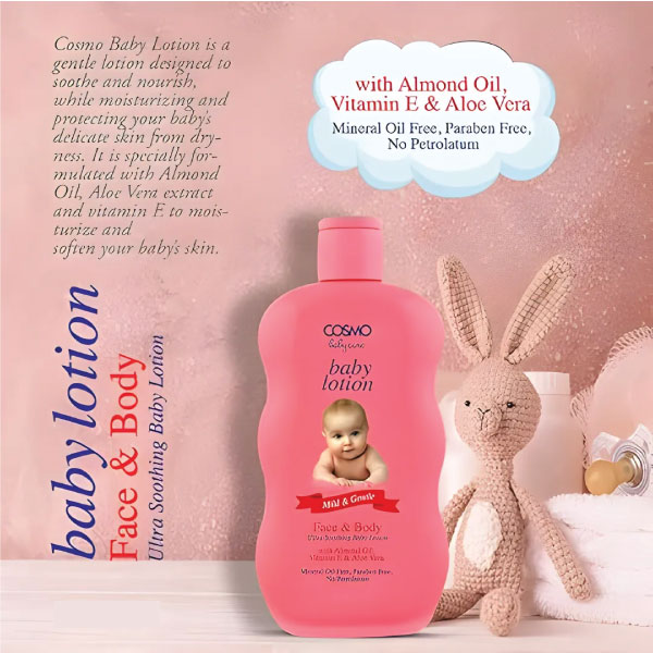 Cosmo Baby Lotion is a gentle lotion designed to soothe and nourish, while moisturizing and protecting your baby’s delicate skin from dryness. It is specially formulated with Almond Oil, Aloe Vera extract and vitamin E to moisturize and soften your baby’s skin.