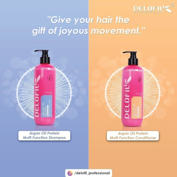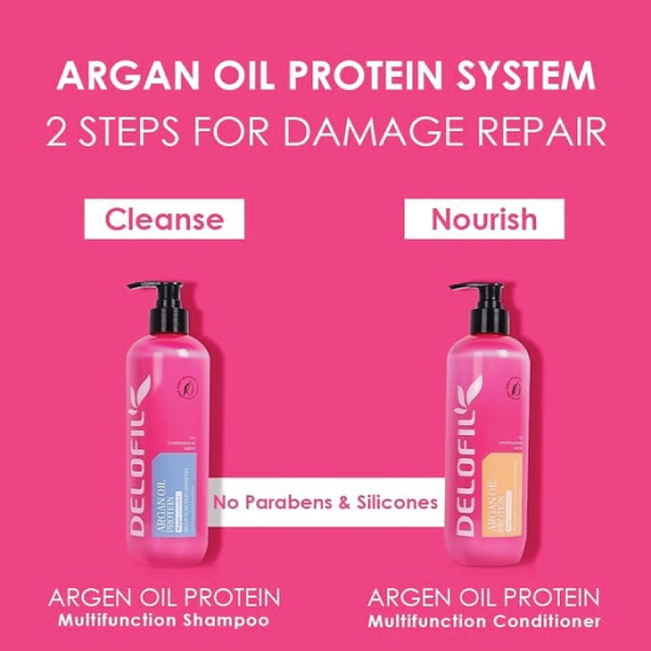 The Delofil Protein Argan Oil Multi-Function Shampoo and Conditioner (500ml) is a hair care set that nourishes, strengthens, and adds shine to all hair types, especially color-treated hair. It is formulated with a protein mix and argan oil to deeply moisturize, fight frizz, reduce breakage, and protect hair from damage caused by styling and environmental stressors. The set is free from sulfates and parabens, making it gentle on sensitive and color-treated hair.