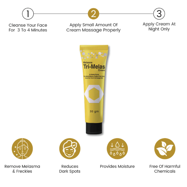 - Apply Tri Melas Cream for freckles, dark spots, melasma, and pigmentation. Slightly massage to absorb completely.