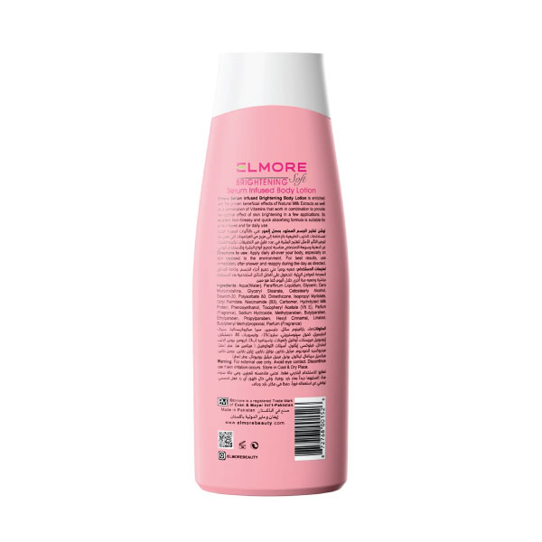 Elmore Brightening Body Lotion is formulated to visibly lighten, hydrate, and enhance your skin tone. Powered by a gentle brightening complex, it targets dark spots and uneven patches while providing daily moisture. Perfect for those seeking a luminous and youthful glow, this top body lotion in Pakistan helps you achieve visibly brighter, smoother, and healthier skin with every application.
