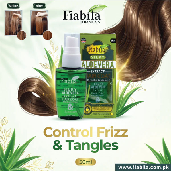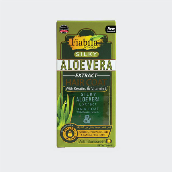 Experience instant smoothness with Fiabila Silky Aloe Vera Extract Hair Coat — a lightweight, non-sticky serum designed to tame frizz, control flyaways, and add a silky shine to your hair. Enriched with Aloe Vera Extract, Keratin, Vitamin E, and UV Sunscreen, it nourishes each strand while protecting your hair from sun damage, dryness, and daily styling stress.