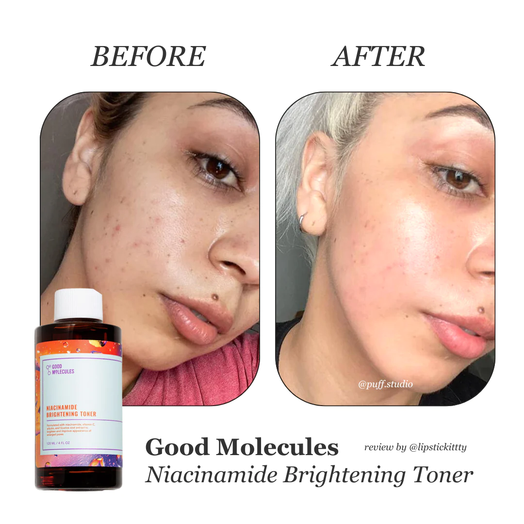 Promote bright, even skin and less visible pores with this alcohol-free toner from Good Molecules. Niacinamide Brightening Toner is formulated with a soothing blend of brightening ingredients that work to reduce the appearance of dullness, uneven skin tone, and enlarged pores.