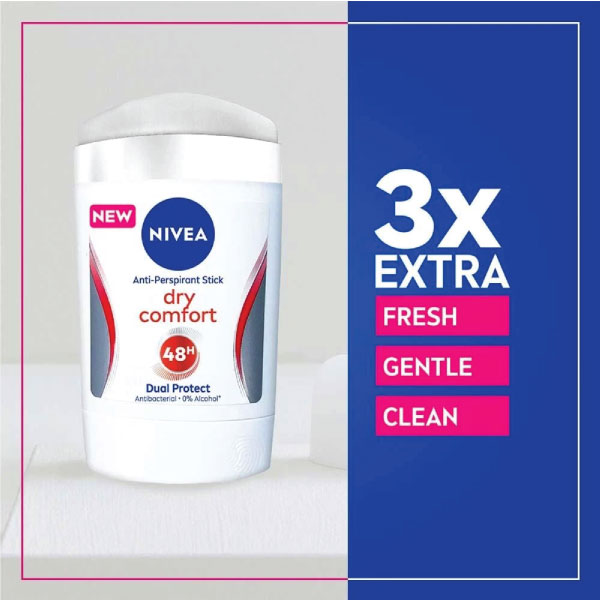 Thanks to the new emulsion technology, the antiperspirant stickNIVEADry Comfort offers reliable protection for 48 hours, as well as an easy application.whichlight. Enjoy the freshness of your skin, without the feeling oflipFormulated for double protection, it contains two substancesActiveE, with a strong antiperspirant effect. Dermatologically tested formulation, withoutcoolethyl, is gentle on your skin. Discover the new and modern packaging, designed for an intuitive user experience. With 25% more content and 30% less plastic (*per ml, compared to the previous packaging ofNIVEADeo stick). Transparent Antiperspirant StickNIVEADry Comfort is a 100% climate neutral** product.