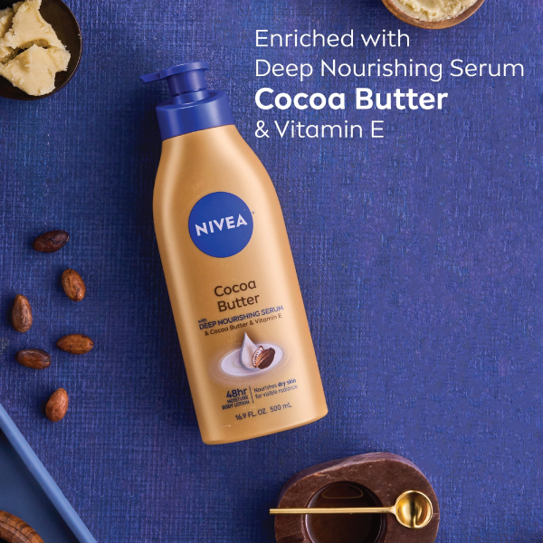 The Cocoa Butter body lotion transform your dry skin into deeply moisturised and noticeably smoother skin for 48h. It is infused with the NIVEA DEEP MOISTURE SERUM and precious cocoa butter and vitamin E. The body lotion provides moisture and smoothness away dullness for 48h – leaving your skin nicely fragranced with a scent of cocoa – after just 1 application.