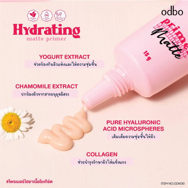 The latest arrival right here is with Odbo Hydrating Matte Primer. Also known as, Yogurt Primer. The airy and lightweight primer is easy when apply. Smooth and blend tightly to the skin. Helps to blur pores and smoothen skin textures. Perfect for oil control throughout the day. Lock up your makeup for even more long-lasting results. Can be used to apply before putting on makeup to help makeup last longer or after makeup to blur pores. Either way, the primer will not disturb the makeup. Free of paraben and alcohol. Can be used with all skin types. The primer contains yogurt extract that helps to moisturize and reduce aging. Also, collagen helps to strengthen skin health. The chamomile in the ingredient acts as an antioxidant which slows down the skin age. Lastly, HYA helps to increase moisture.