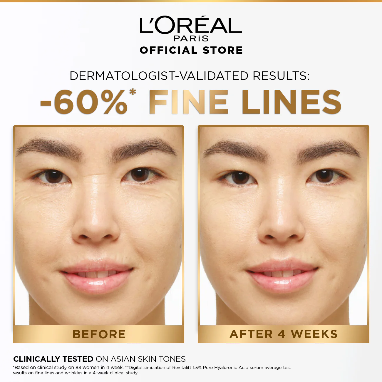 For best results, use face serum day and night, together with derm validated L’Oréal Paris Revitalift 1.5% Hyaluronic Acid cream.
